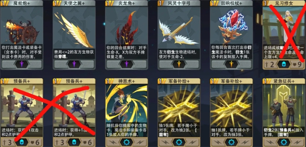 ——装备:荣耀权杖、天使翼(穿透直伤)等。,主要是为了直伤。其中,装备中的突击戟比较特殊。只有在你有天使翼的前提下才考虑拿,没有天使翼就不要拿。装备配合魔法卡升级后,神恩术拿到了手牌。
